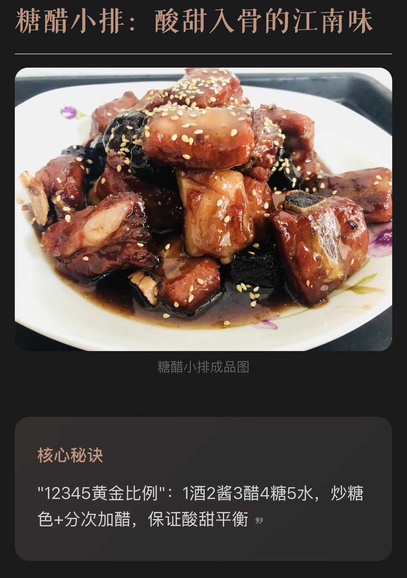 而即便在生活助手上,灵光也显现了其不俗的技能,在询问糖醋小排的做法时他也可以顺利产出详细步骤并配图展示。