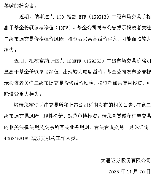 【风险提示】关于纳斯达克 100 指数ETF、汇添富纳斯达克 100ETF交易风险提示公告