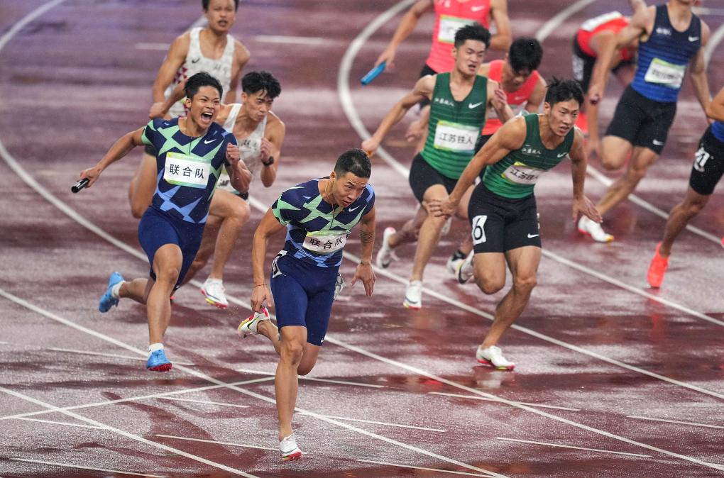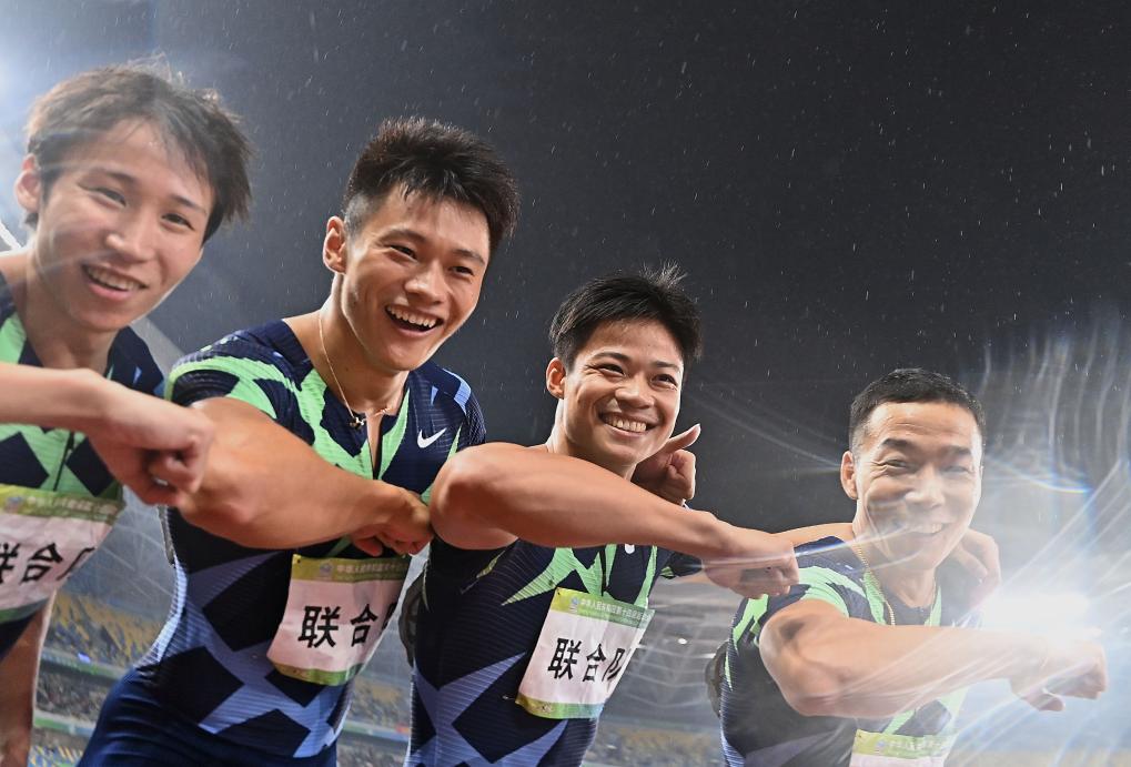 2021年9月24日,联合队选手汤星强、谢震业、苏炳添和吴智强(从左至右)在第十四届全国运动会田径男子4x100米接力决赛后庆祝,联合队以38秒50的成绩获得冠军。新华社记者 李一博 摄