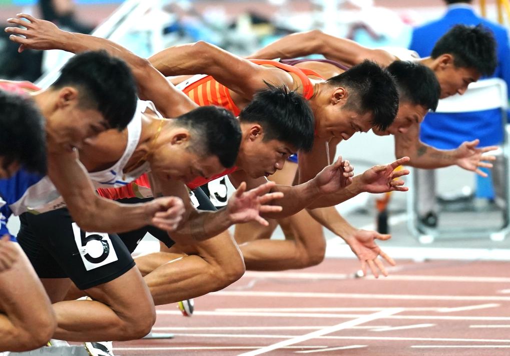 2021年9月21日,苏炳添(左三)在第十四届全国运动会田径男子百米决赛中起跑,最终他以9秒95的成绩夺得冠军。新华社记者 彭子洋 摄
