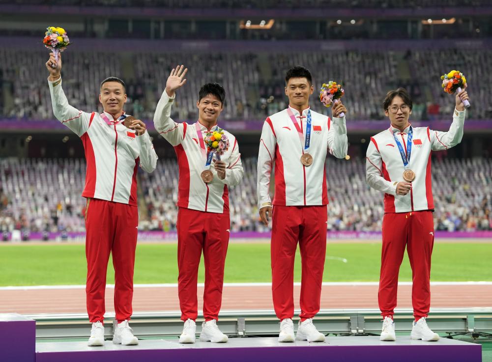 2023年10月4日,汤星强、谢震业、苏炳添、吴智强(从右至左)在递补奥运奖牌颁奖仪式上,他们递补获得东京奥运会男子4X100米接力铜牌。新华社记者 孙非 摄