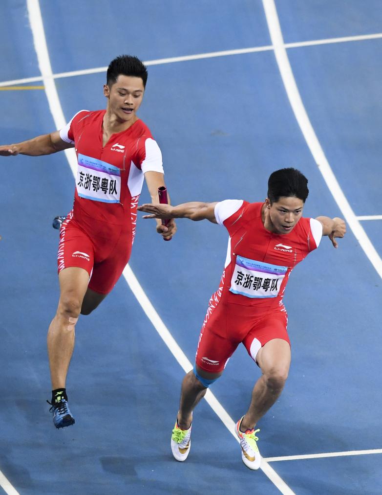 2017年9月7日,在第十三届全国运动会田径项目男子4×100米接力决赛中,京浙鄂粤队选手谢震业(左)与苏炳添在交接棒,吴智强(湖北)、谢震业(浙江)、苏炳添(广东)与张培萌(北京)组成的京浙鄂粤队以38秒16的成绩,夺得冠军。新华社记者 赵戈 摄