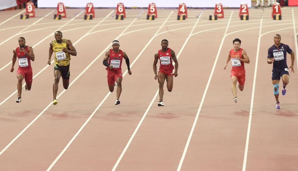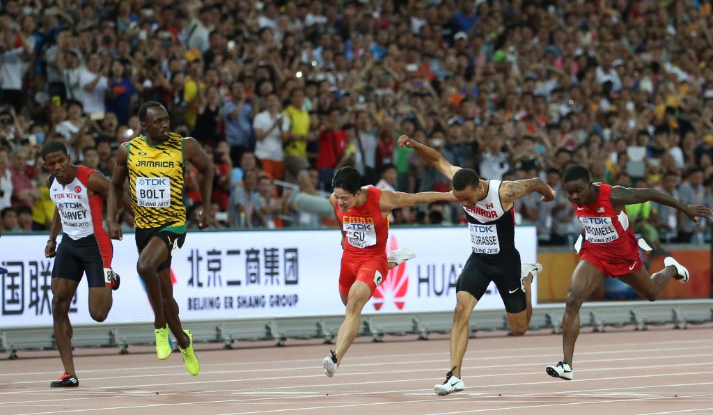 2015年8月23日,苏炳添(右二)参加2015年国际田联田径世锦赛男子100米决赛,这是他首次征战世锦赛百米决赛。新华社记者 公磊 摄