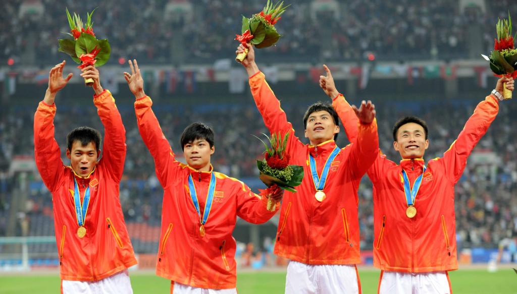 为中国队夺得一枚亚运会男子4x100米接力金牌