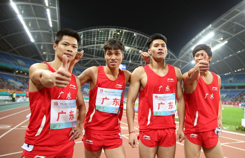 2013年9月11日,广东队选手苏炳添、莫有雪、梁嘉鸿和谭巨全(从左至右)在第十二届全国运动会田径男子4X100米夺冠后庆祝,广东队以38秒73的成绩夺得冠军。新华社记者 廖宇杰 摄