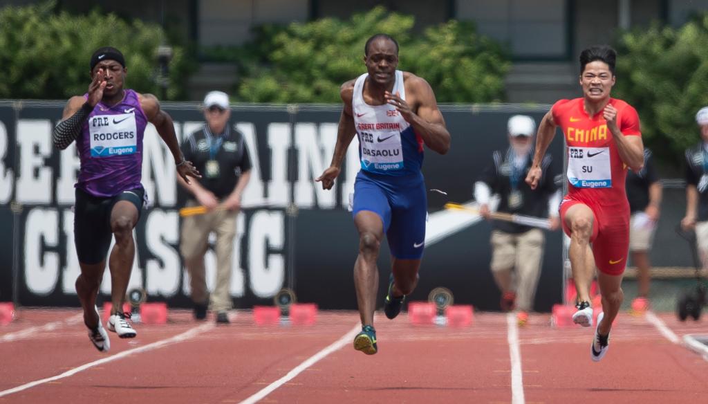 2015年5月30日,苏炳添(右一)在国际田联钻石联赛尤金站男子100米比赛中,最终他以9秒99的成绩获得第三名并打破全国纪录。新华社记者 杨磊 摄