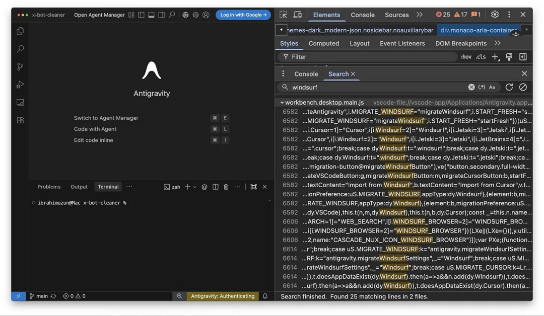 最初,人们注意到它的界面和行为方式非常像 VS Code 的一个分支。但随着更多开发者深入分析,一个更大胆的猜测被提出:Antigravity 不只是 VS Code fork,它更像是 Windsurf 的专有分支版本。而 Windsurf 是一款闭源 IDE,Google 曾为其技术授权付出约 24 亿美元。