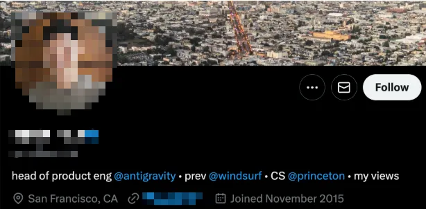 一边是“抄作业”,另一边,创始人本人却在公共叙事中主动与 Windsurf“切割”。作为 Windsurf 的创始人,Varun 在自己的 X 简介里已彻底抹掉 Windsurf 的存在,仿佛那段创业经历不曾发生。