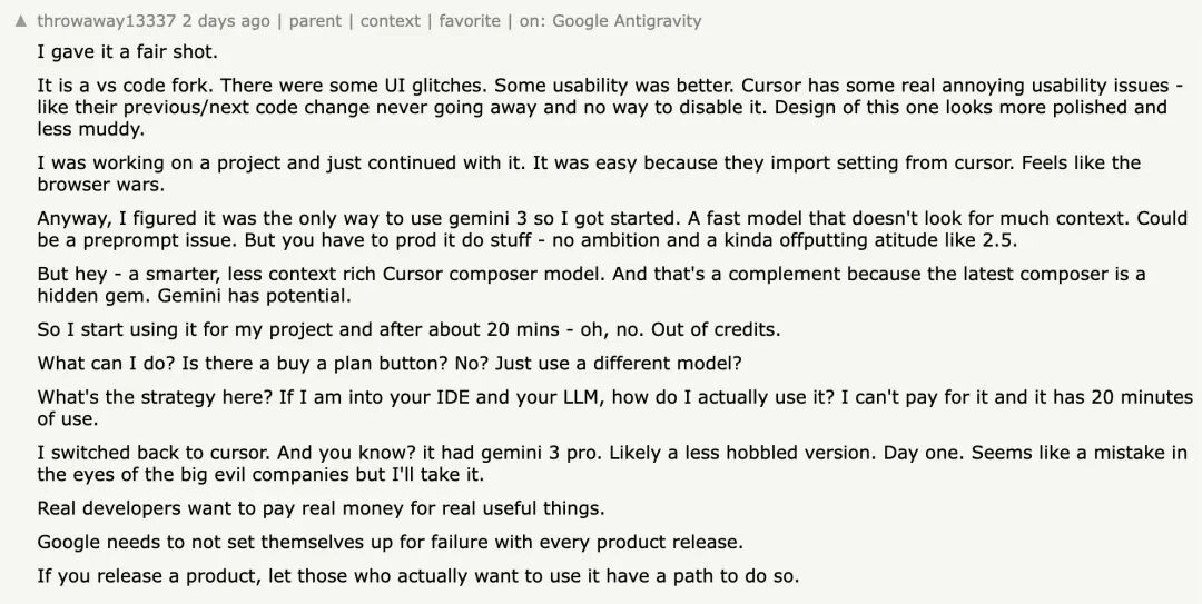 Google 前天发布了 Antigravity,一款号称“下一代 agentic 开发平台”的全新 IDE。官方宣传强调它能规划、执行、验证整个开发流程,似乎代表着 AI 编程进入了新的阶段。然而,最早一批上手使用的开发者却纷纷吐槽:任务跑着跑着就因“模型过载”中断,信用额度几十分钟内耗尽,连完整测试都难以完成,体验堪称“开局即崩”。