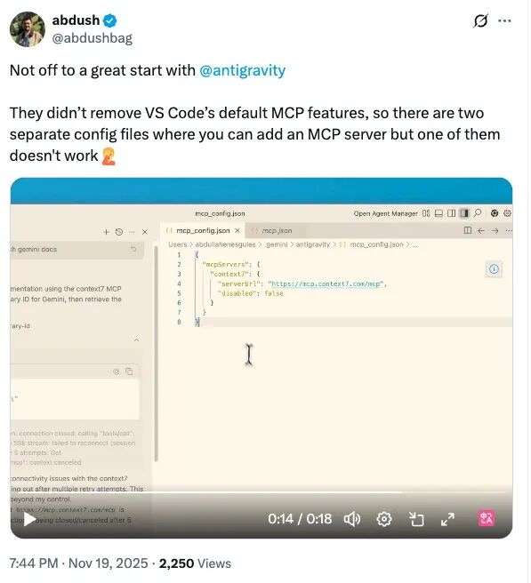 一位开发者在 X 上吐槽说,团队显然没有把 VS Code 默认的 MCP 功能移除干净,导致界面里出现两个可以添加 MCP Server 的配置入口 ——但其中一个根本不能用,只能看着发愣。他无奈地配上一句:“Not off to a great start with @antigravity ……”(开局就这么拉胯)。