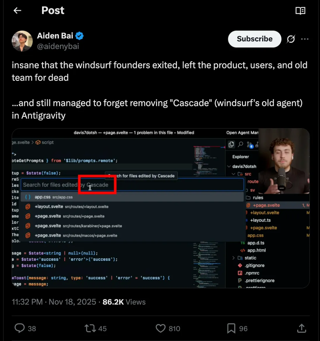 这种反差,让外界更加好奇:既然 Antigravity 的基础如此明显地承袭自 Windsurf,Varun 到底想把 Antigravity 讲成什么?