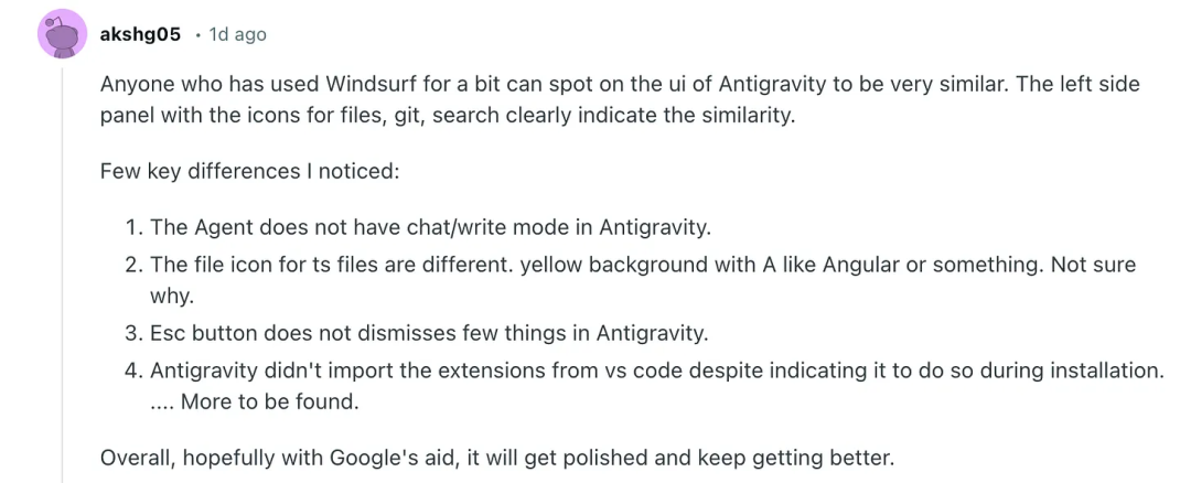 但在 Google 的 Antigravity 这里,用户必须自己深挖——从 UI 相似性,到代码线索,再到社区爆料,拼出一个近乎“侦探式”的真相:Antigravity 的内核其实是 Windsurf。只有读到类似本文这样的分析,才有机会看到全貌。