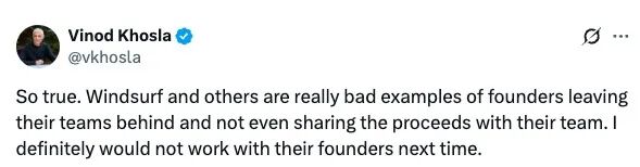 而 Google 的这次“专有分叉”,代价尤为惊人。公开信息显示,在 Windsurf 被 Cognition(即开发 Devin 的公司)收购之前,Google 曾以约 24 亿美元的价格获得了 Windsurf 技术的授权。这笔交易当时就在硅谷投资圈内引发争议,不少人认为这样的创业者应该被拉入黑名单。知名投资人、亿万富豪 Vinod Khosla 评论说 Windsurf 这个交易给创始人“留下了非常糟糕的示范”。