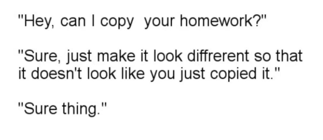 “嘿,我能抄你的作业吗?”“当然,但记得改一点,别看起来像直接抄的。”“没问题。”