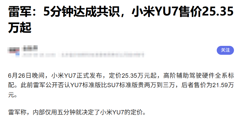 江湖上传闻,YU7的定价只用了5分钟,这并非鲁莽,而是其底层商业逻辑极度清晰的体现——不需要复杂的价值测算,只需要成为一个无情的“行业价格屠夫”。