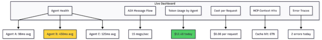 警报:智能体 B 响应时间增加当前:450 毫秒(基准线的 3 倍)可能原因:MCP 服务器过载建议:启用上下文缓存提示:您每天使用 15K 令牌进行文档查找预计通过缓存可节省:$140/月是否启用?[Y/n]