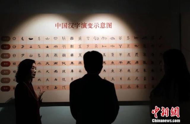 位于四川省成都市的东方汉字博物馆,是一家以汉字为主题的博物馆。图为参观者在东方汉字博物馆观看中国汉字演变示意图。中新社记者 王磊 摄