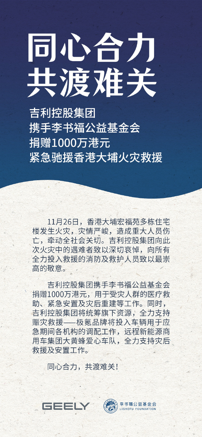 今日,多家车企宣布捐款,驰援香港大埔宏福苑火灾救援。
