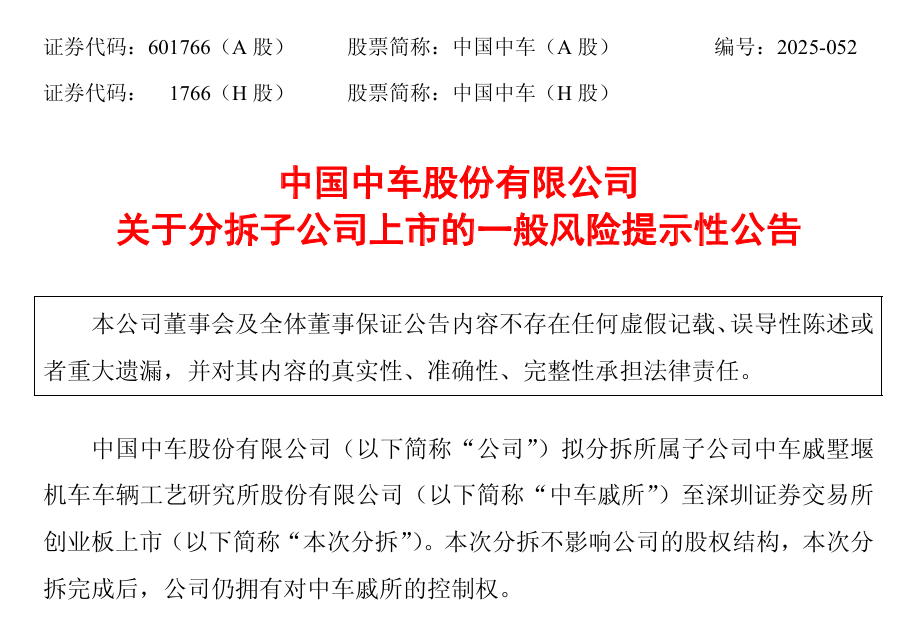 2025年11月27日晚,中国中车股份有限公司发布《关于分拆子公司上市的一般风险提示性公告》。公告称,拟分拆所属子公司中车戚墅堰机车车辆工艺研究所股份有限公司至深交所创业板上市。本次分拆不影响中国中车的股权结构,公司仍拥有对中车戚所的控制权。