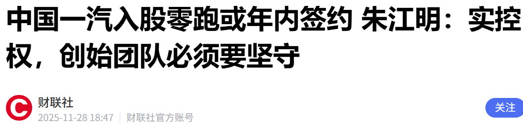 值得一提的是,零跑汽车董事长朱江明在前一天(11月27日)再次否认了“一汽收购零跑”的传闻,但确认了股权合作在探讨中。他强调创始团队希望保持实控权,投资者更多是作为投资人角色。他强调:“我们还是希望我们创始团队是实控的,哪怕一汽或者别的车企投资零跑,更多可能是作为投资人的角色,这个是我们必须要坚守的。”据悉这项交易预计在年内正式签署协议,一汽的初步持股比例约为5%。股权结构方面,截至今年6月30日,零跑汽车创始人集团与一致行动人持有25.8%的股权,Stellantis集团持股21.26%。这意味着一汽入股5%后,将成为重要股东但不会改变创始团队的控股权。