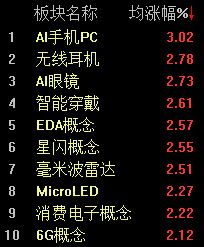 板块方面,屏下摄像、卫星互联网、消费电子、AI手机、6G概念等涨幅居前,电源设备、DRG/DIP、风电设备表现不佳,领跌市场。