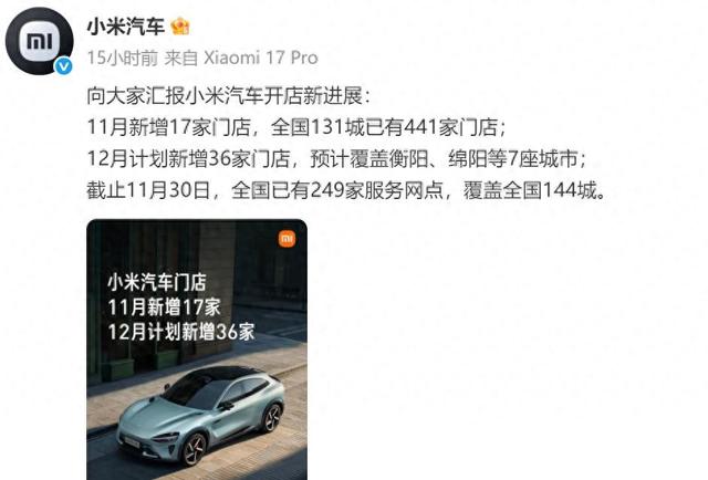 【环球网互娱综合报道】12月1日消息,小米汽车官方在社交平台公布其开店新进展: