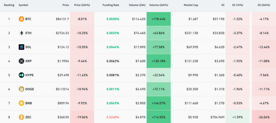 北京时间12月1日晚间,比特币大幅下跌,一度跌至83973.9美元,过去24小时内跌8.17%,截至发稿报841131.7美元,过去24小时内跌8.01%;以太坊跌至2724.53美元,过去24小时内跌10.25%。