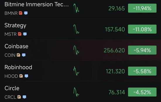 美股加密货币概念股短线下挫,截至发稿,BMNR跌逾11%,Strategy跌超11%,Robinhood、Coinbase跌超5%,Circle跌超4%。