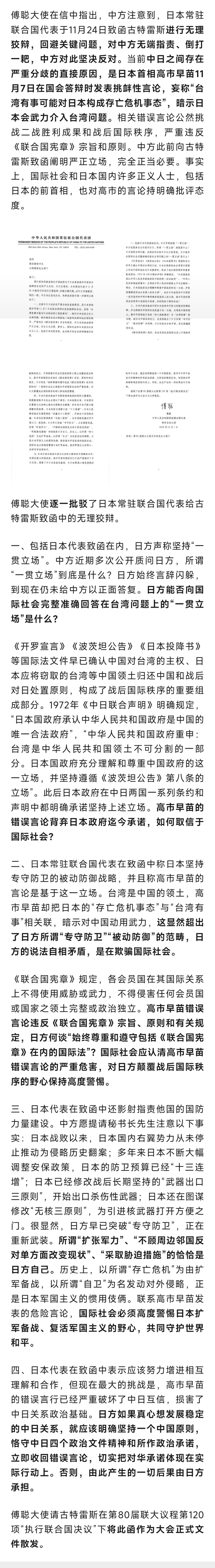 12月1日,中国常驻联合国代表傅聪再次致函联合国秘书长古特雷斯,针对日本常驻联合国代表山崎和之11月24日给古特雷斯秘书长致函中有关无理狡辩言论予以严正批驳,并阐明中国政府立场。