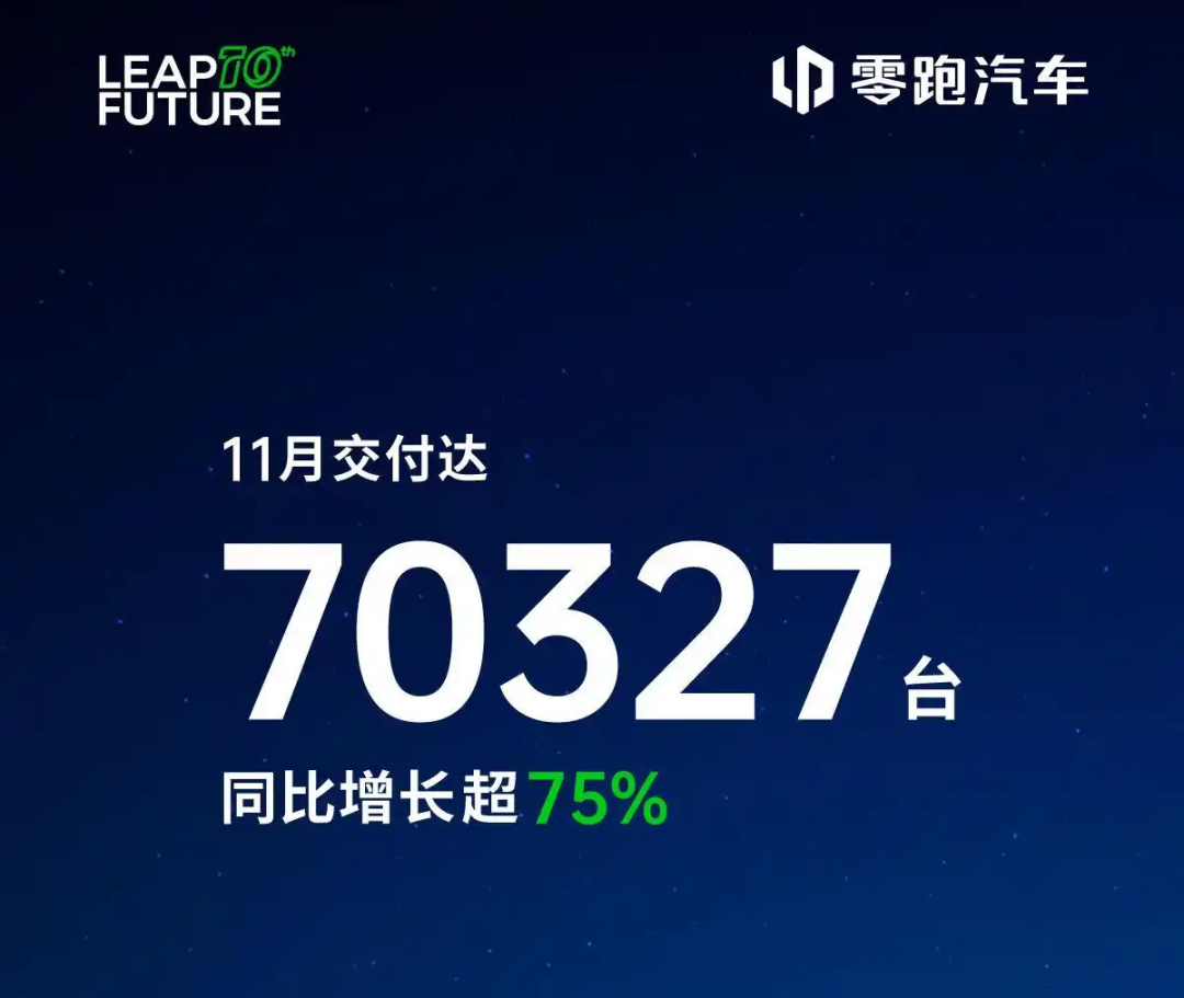 电动知家消息,2025年12月1日,零跑汽车(09863.HK)公布最新交付数据:11月,零跑全系交付再创新高达70327台,持续刷新造车新势力月销纪录。自今年3月起,零跑汽车已连续9个月保持强劲增长态势。