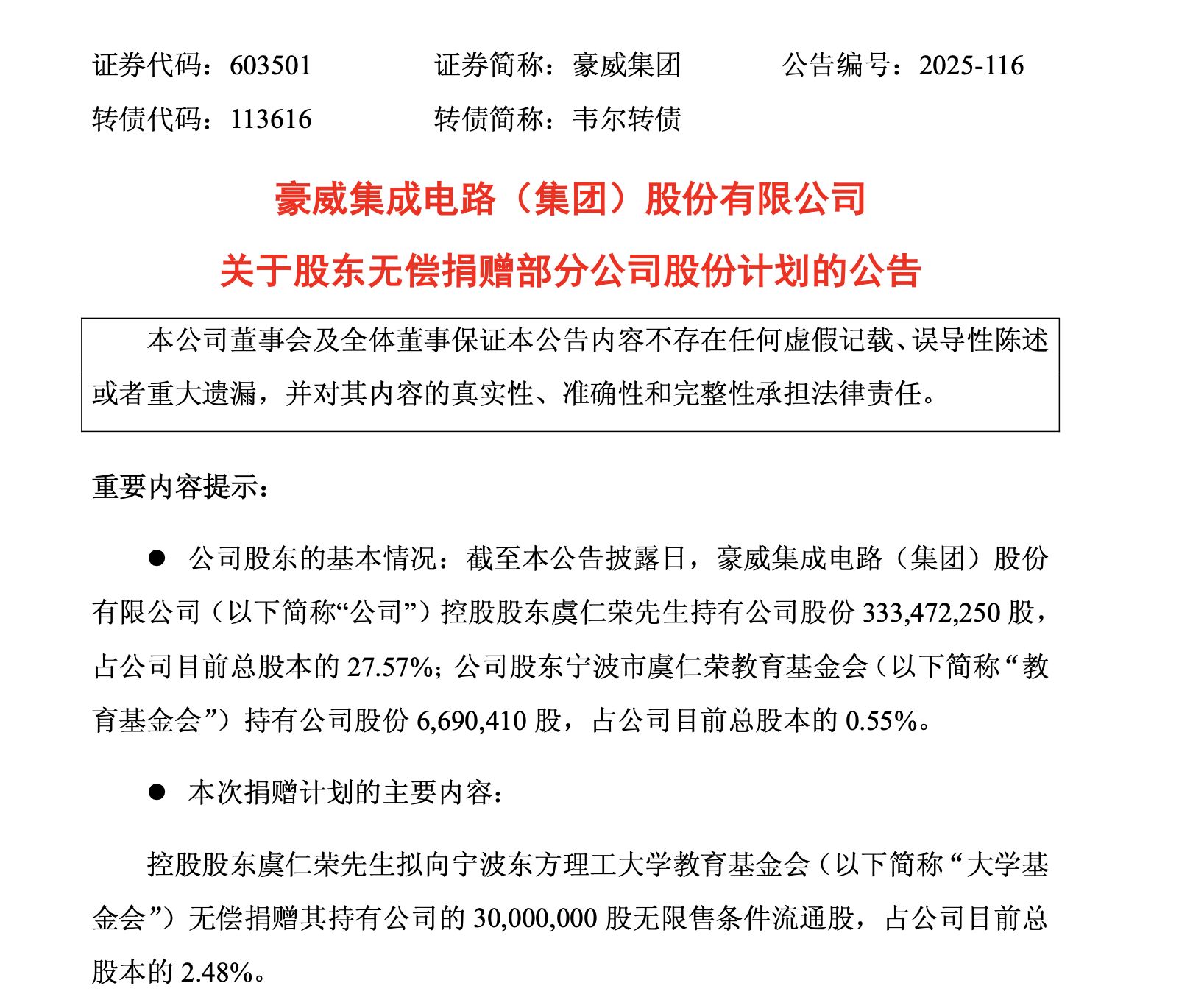 12月2日晚间,豪威集团(603501.SH,股价121.08元,市值1464.35亿元)公告称,控股股东虞仁荣拟向宁波东方理工大学教育基金会(简称“大学基金会”)无偿捐赠其持有公司的3000万股无限售条件流通股,占公司目前总股本的2.48%;股东宁波市虞仁荣教育基金会拟向大学基金会无偿捐赠其持有公司的60万股无限售条件流通股,约占公司目前总股本的0.05%。