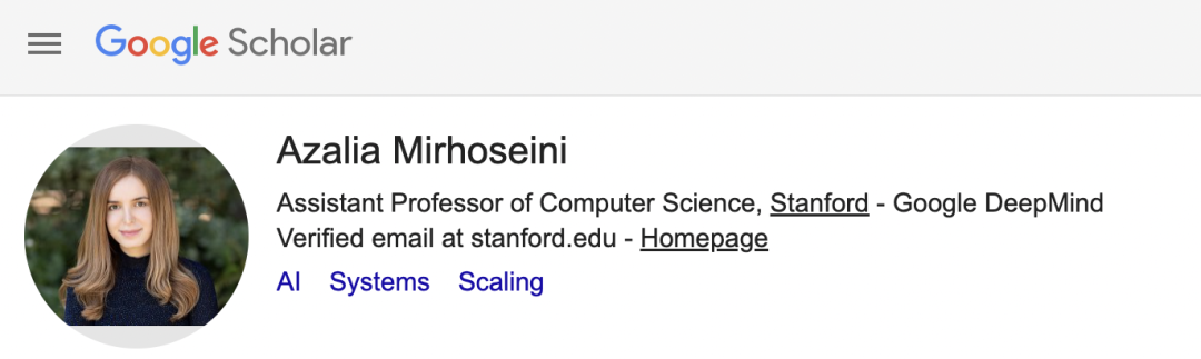 而 Azalia Mirhoseini 目前是斯坦福大学助理教授,之前是谷歌 DeepMind 的高级研究员。