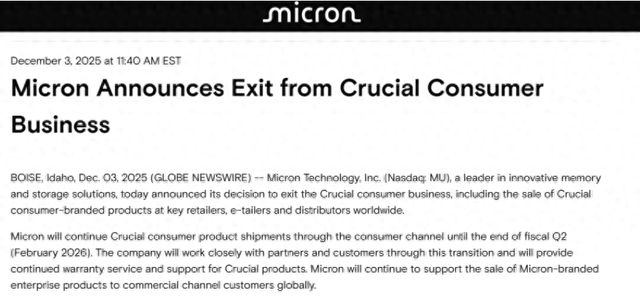 根据美光科技发布的官方公告,公司将逐步退出Crucial品牌的消费级内存和存储产品业务。现有的零售渠道库存将继续销售至2026财年第二季度末(约2026年2月)。美光强调,这一决定不影响对其全球商业与企业渠道客户的美光品牌企业级产品供应,所有现有Crucial产品的保修服务也将继续履行。