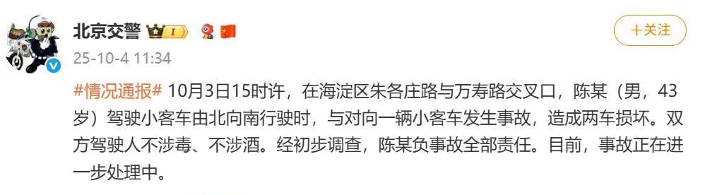 2025年10月3日下午,有网友曝出图片,称车评人陈震发生交通事故。北京市交管部门于10月4日通报,事故双方均未涉酒涉毒,陈某负事故全部责任。