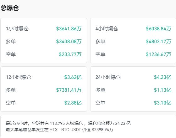 比特币报93020.42美元,涨幅2.63%。截至发稿,加密货币全网超11万人爆仓,4.23亿美元(约合人民币30亿元)蒸发。