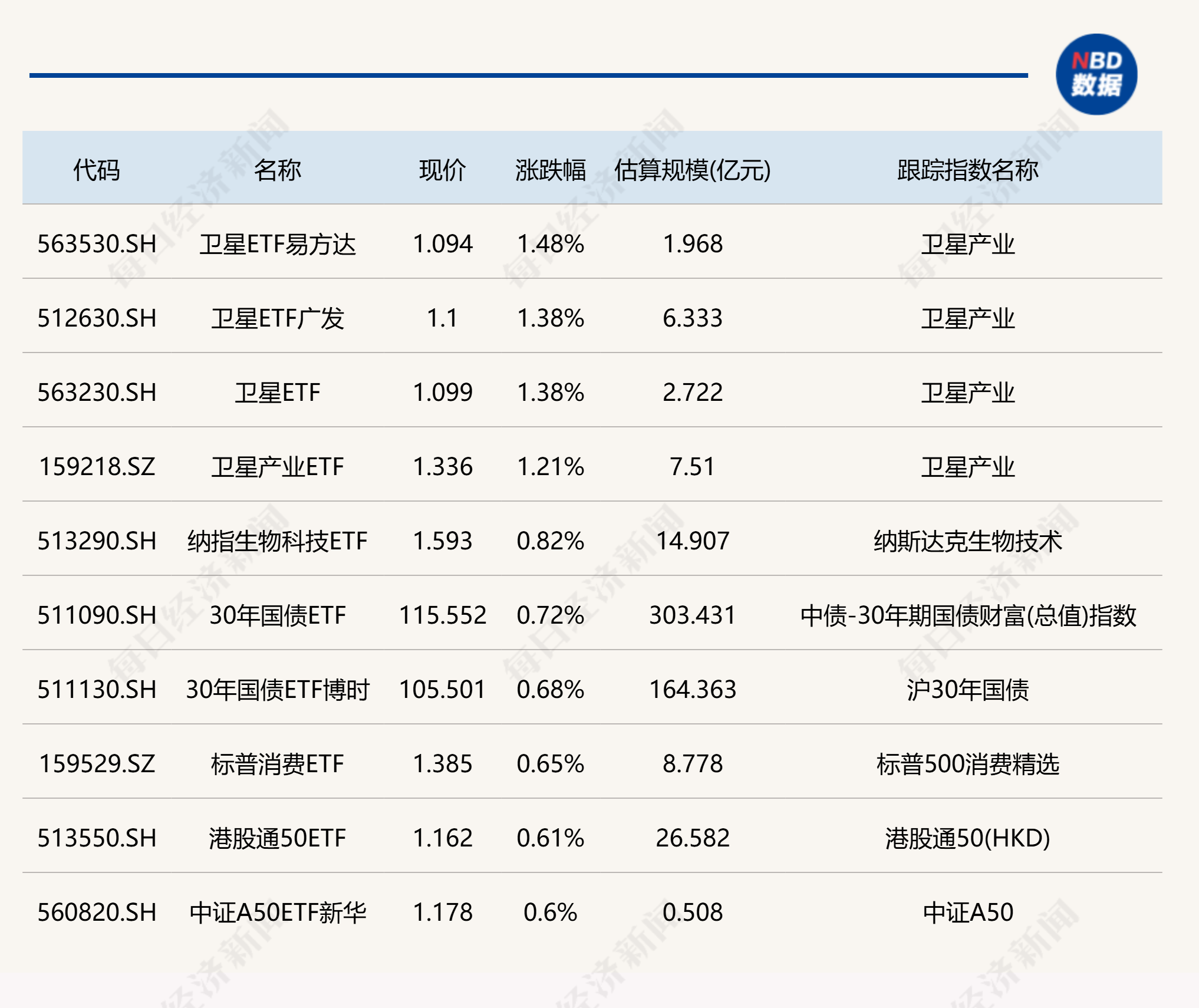 ETF涨跌幅方面,卫星相关ETF涨超1%。