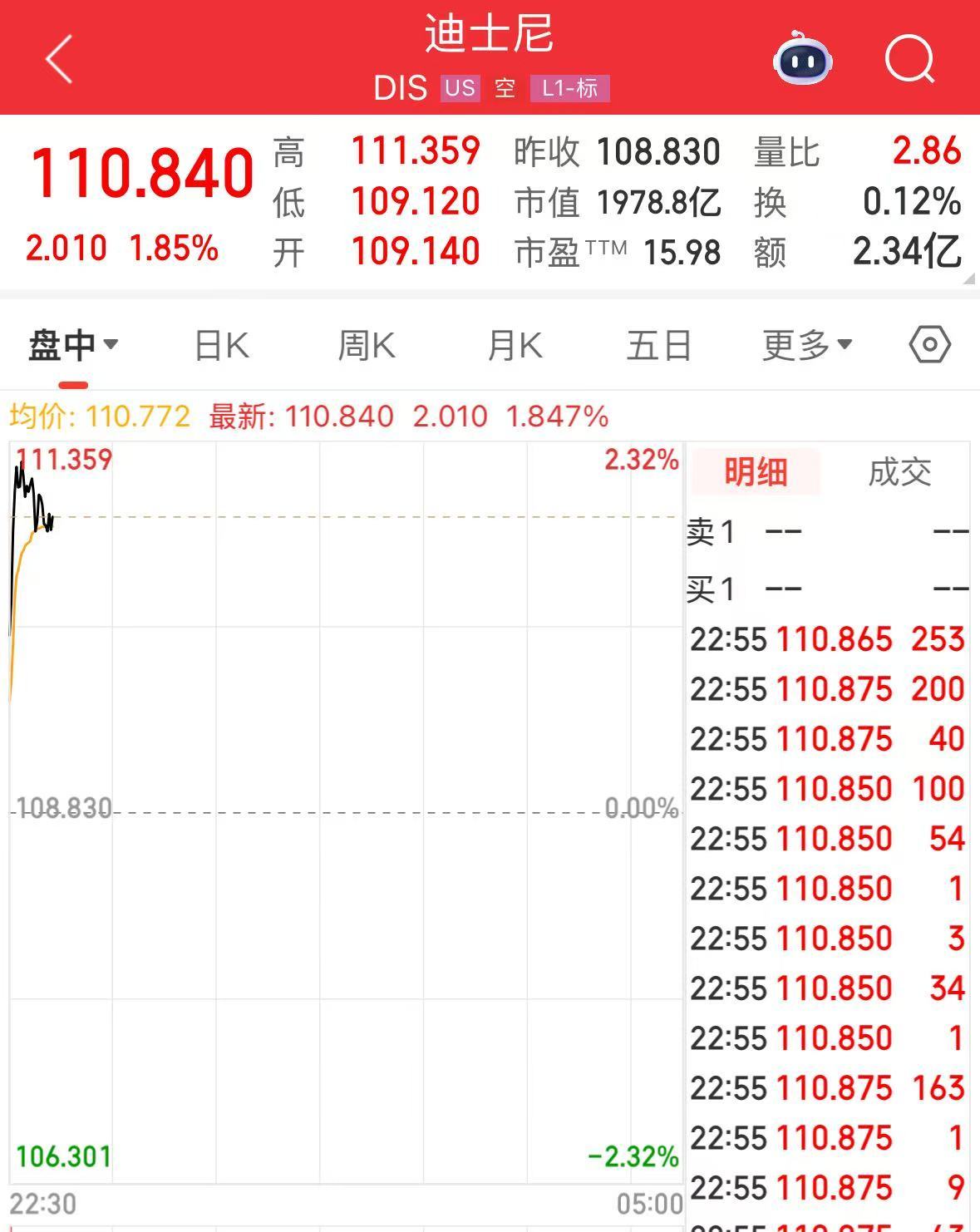 迪士尼上涨1.85%,一度涨超2.3%。