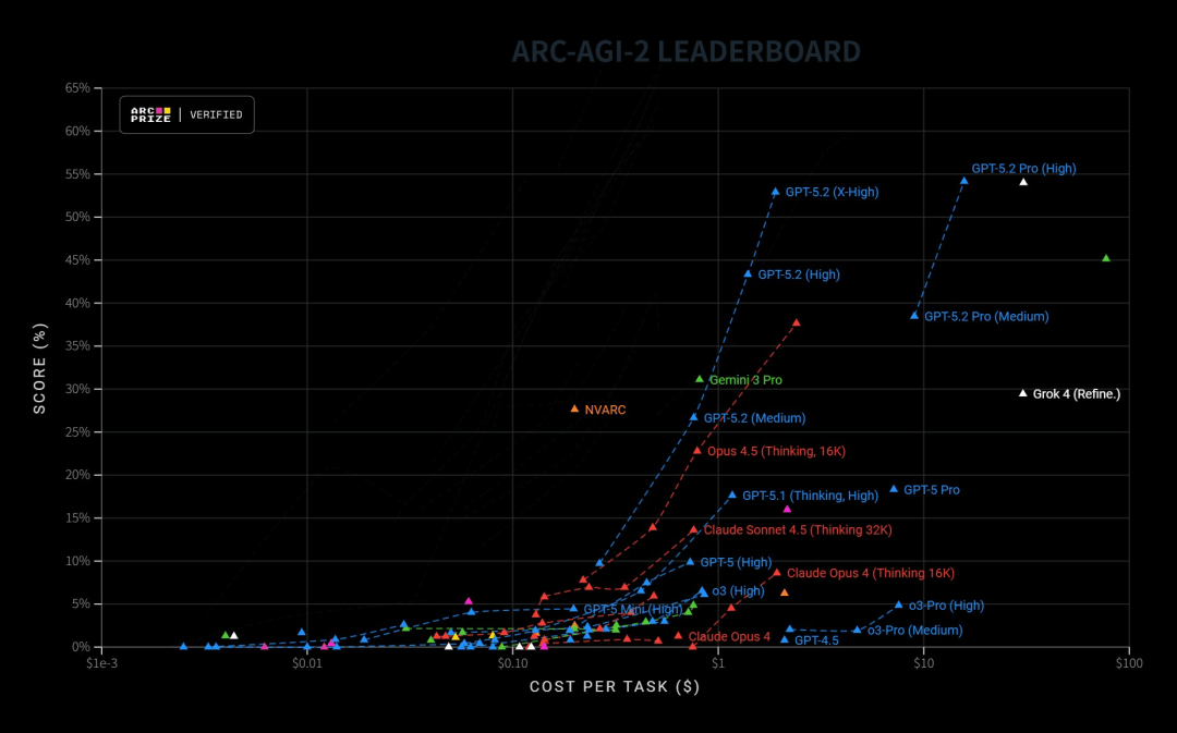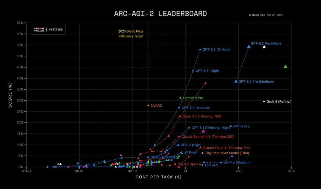GPT‑5.2 Pro表现更高,达到54.2%,进一步扩展了模型推理新颖、抽象问题的能力。
