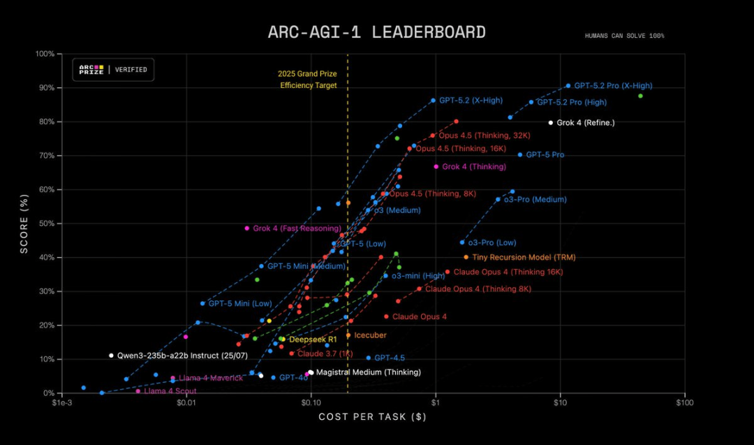 在衡量通用推理能力的基准测试ARC-AGI-1(Verified)上,GPT‑5.2 Pro是第一个跨越90%门槛的模型。