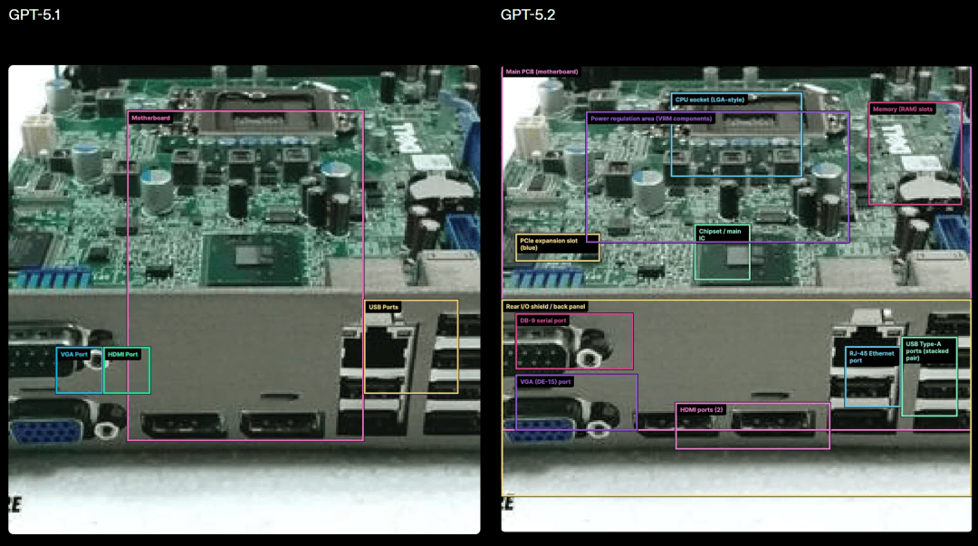 即使在低质量图像上,GPT‑5.2也能识别主要区域并放置与每个组件的真实位置大致匹配的框,而GPT‑5.1仅标记了几个部分,并且对其空间排列的理解要弱得多。