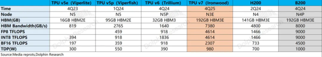 c)“谷歌Gemini+博通”竞争力的提升:一方面谷歌近期开始量产的TPUv7在性能上已经超过了H200,部分指标也开始向英伟达的B200产品靠近;另一方面谷歌自身的Gemini大模型表现并不逊色于依托英伟达的GPT表现。