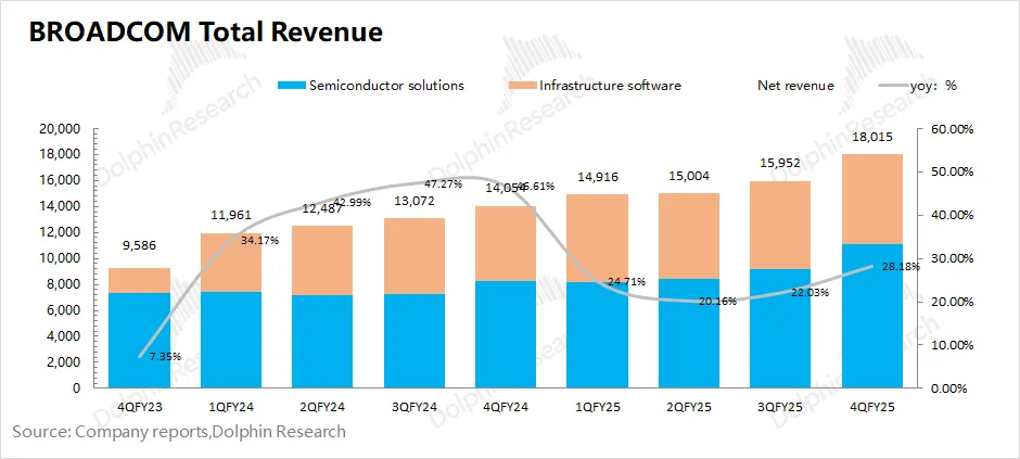 博通BROADCOM (AVGO.O)在2025财年第四季度实现营收180亿美元,同比增长28%,好于市场预期(175亿美元)。同比增长主要来自于AI业务增长的带动。