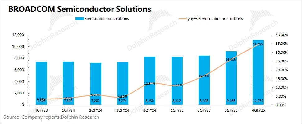 博通BROADCOM (AVGO.O)在2025财年第四季度的半导体解决方案实现营收110.7亿美元,同比增长34.5%。公司半导体业务本季度的增长主要来自于AI业务的带动,非AI业务保持平稳。