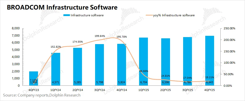 博通BROADCOM (AVGO.O)在2025财年第四季度的基础设施软件实现营收69.4亿美元,同比增长19%。增长主要来自于VMware的并购整合和收费模式调整(从永久许可证模式全面转向于订阅模式)。