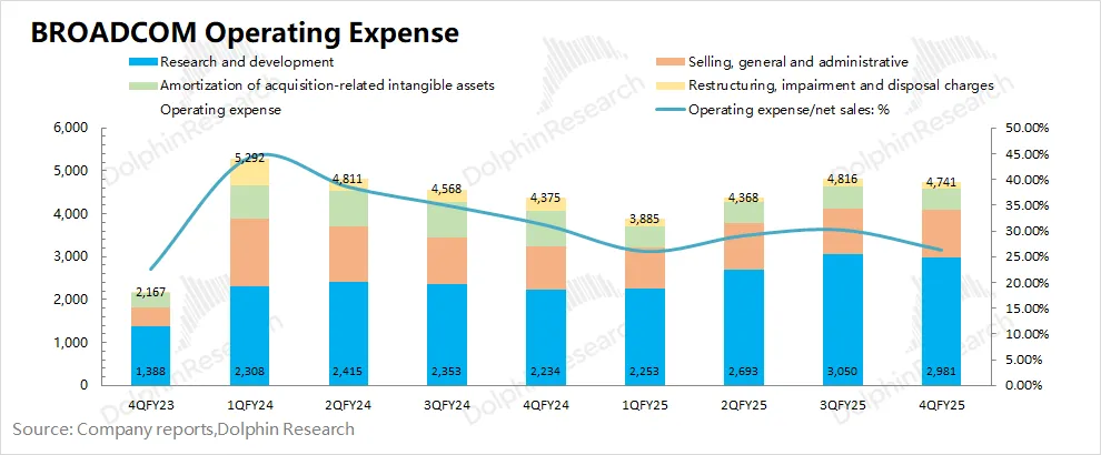 博通BROADCOM (AVGO.O)在2025财年第四季度的经营费用为47.4亿美元,环比略有回落。