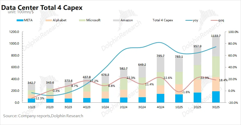 结合各家大厂情况,海豚君预计四大核心云厂商(谷歌、Meta、微软和亚马逊)的合计资本开支在2026年有望接近6000亿美元左右,同比增长40%,这为明年AI 芯片市场需求的增长提供了保障。