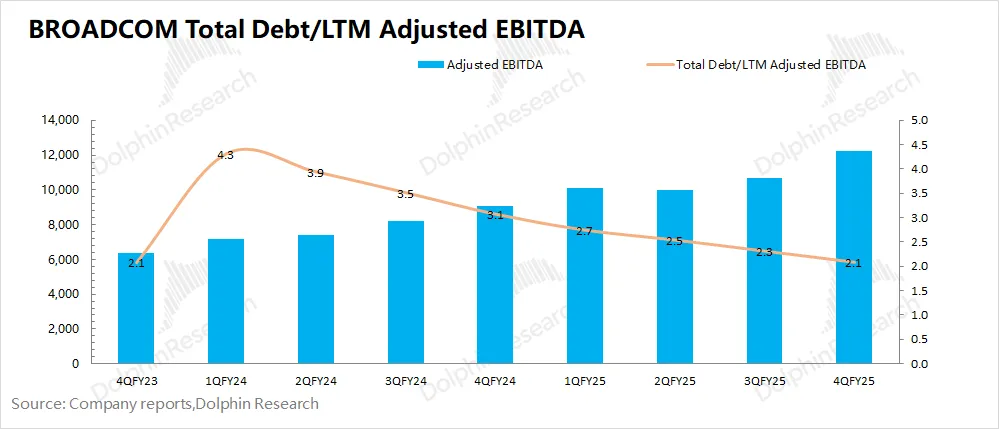 由于博通擅长外延并购,公司通常把调整后EBITDA%作为公司的经营面指标之一。而海豚君测算公司2025财年第四季度的调整后EBITDA%回升至67.8%,好于公司此前指引(67%)。