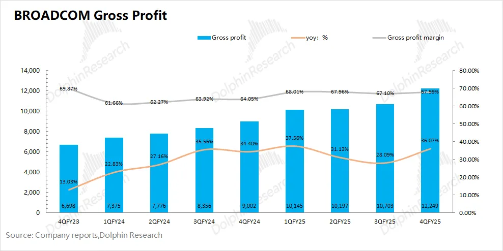 博通BROADCOM (AVGO.O)在2025财年第四季度实现毛利122.5亿美元,同比增长36%。其中博通在本季度的毛利率为68%,环比回升。