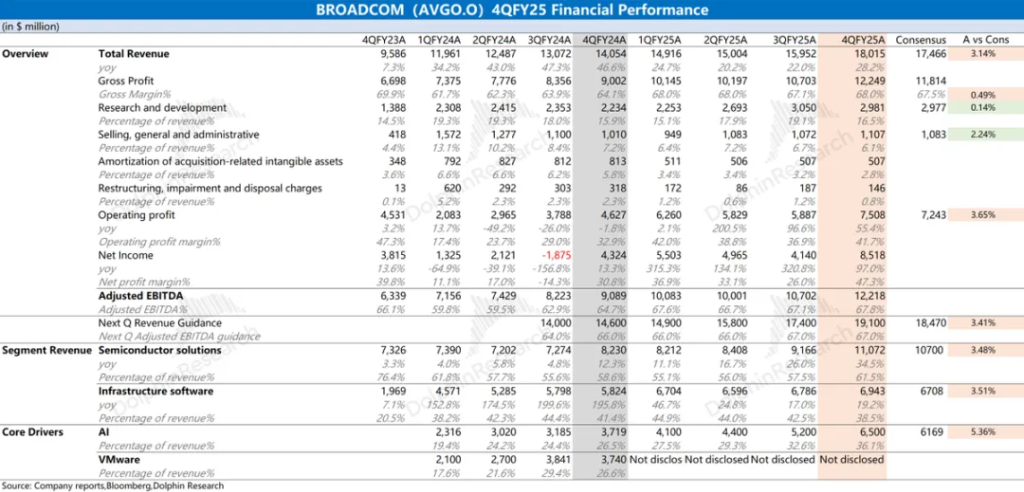 博通BROADCOM (AVGO.O)在2025财年第四季度实现净利润85.2亿美元。