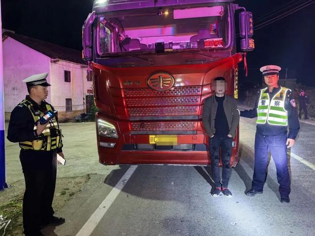 11月14日,贺州市公安局交管支队平桂大队在公会镇省道201线公会法庭路段开展夜查酒驾行动。一辆运载木材的货车靠近检查点时,非但未减速停车接受检查,反而径直偏向路肩行驶,途中撞倒多个锥桶,这一反常举动引起执勤民警警觉。